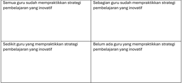 - Pengajar diklat menyiapkan kertas plano yang dibagi menjadi 4 kotak (lihat gambar 2) 4 kotak tersebut menggambarkan pengalaman praktik pedagogis di sekolah Anda.