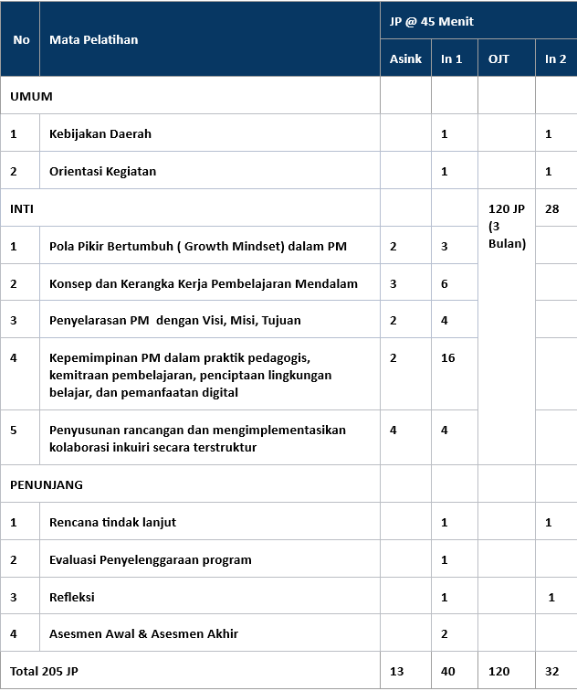 Kegiatan pelatihan moda daring kombinasi diwujudkan dalam tahap IN-1 (In-Service Training) yaitu tahap memahami, melalui asinkron dan sinkron tatap muka, peserta akan mendapatkan pemahaman konseptual tentang Pembelajaran Mendalam yaitu materi umum (kebijakan dan orientasi kegiatan), materi inti, dan materi penunjang.